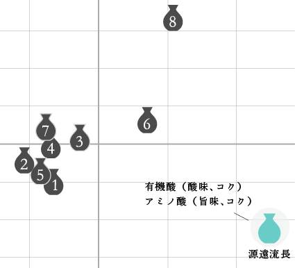 香気成分の分析では、吟醸香のカプロン酸エチルは検出が飽和したため、その他の成分の中で各サンプルの特徴付けに寄与しているものに着目し解析した。日本酒のポジショニングに影響を及ぼしている成分と関連する味わいも合わせて示した。各種エステル類や高級アルコールなどで特徴づけられて、離れた位置にある日本酒7や日本酒8に対して、源遠流長は中央付近に位置した。このことから、源遠流長は他の日本酒より顕著に多く含まれる香気成分はなく、全体的にバランスよく含まれていると考えられる。一方、味関連成分については源遠流長は特異的なポジションにあり、それに影響を及ぼしている成分群は主成分分析により有機酸やアミノ酸であることが分かった。