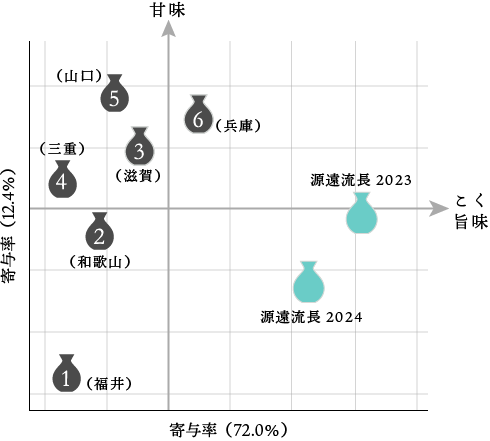 京都酵母は日本酒の味わい、特に有機酸に着目し京都産業技術研究所により開発されている。日本酒中の有機酸は総量が多いほど濃醇さをもたらすと言われている。源遠流長2023は他地域の酒蔵の日本酒を比較して、顕著にリンゴ酸やこはく酸などの有機酸が多いことが特徴であったが、源遠流長2024にも多く含まれていた。