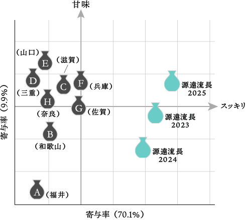 味関連成分に着目した分析では、源遠流長は2023、2024、2025のいずれも特異的なポジションであった。