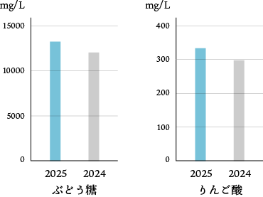 甘酸っぱさに関連する2成分(ぶどう糖とりんご酸)を取り上げて、2024と2025を比較すると2025により多く含まれおり、酵母の特徴が表れていると考えられる。