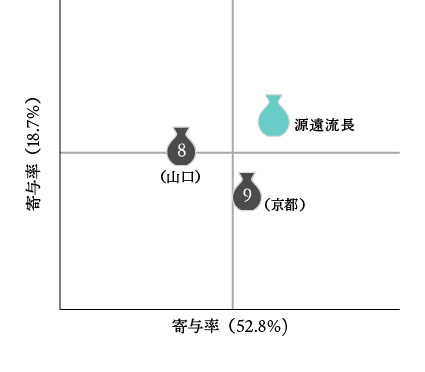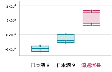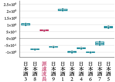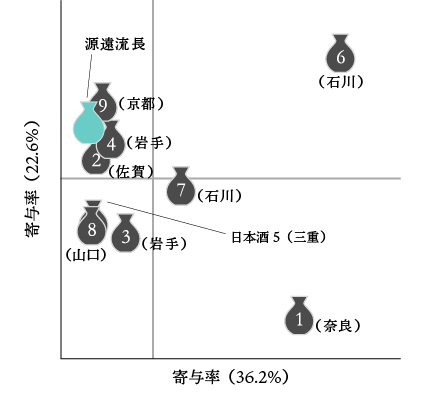 源遠流長は相対的に淡麗で辛口のポジションであった。 同じく招徳酒造で醸造された日本酒9は隣接し、杜氏らしさの表れと考えられる。