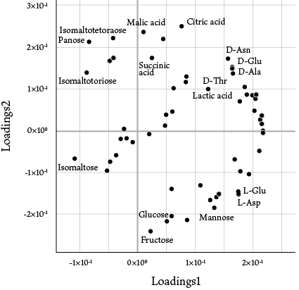 多次元的に存在する数多くの情報を効率よく合成して目に見える形に表現する解析手法。全ての測定値を総合的に取り扱い、視覚的に読み取れる2次元に投影する。スコアプロット(Score plot)では、プロット位置が近いものは類似していると判断され、特徴が近い商品(あるいは違いが大きな商品)を見つけることができる。また、スコアプロットで見える化した差異に対し、試料中に含まれているどの成分が影響を及ぼしているのかをローディングプロット(Loading Plot)で確認できる。