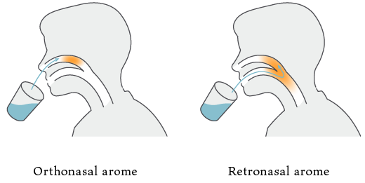 日本酒の入った酒器を鼻に近づけた際にほのかに感じる香り「上立ち香」、日本酒を口に含み、口の中に行き渡った際に広がる香り「含み香」/「口中香」は、きき酒の際の香りの評価方法として使われている。一般的に前者は飲用前に鼻から流入し感じるオルソネーザルアロマ(Orthonasal arome)、後者は口に含んだ後に口から鼻へ流入するレトロネーザルアロマ(Orthonasal arome)と呼ばれている。