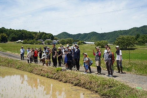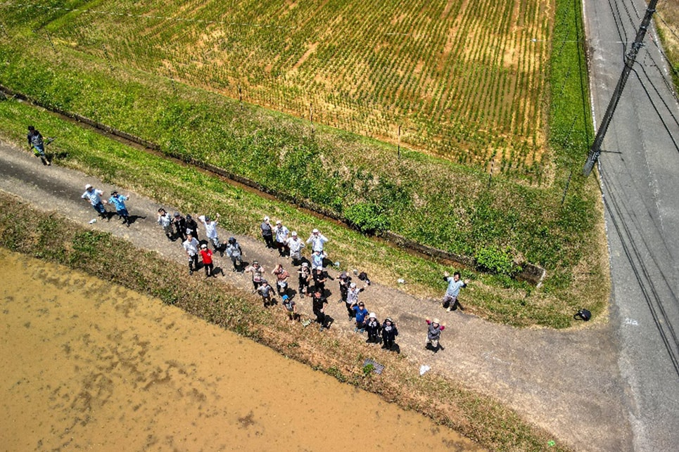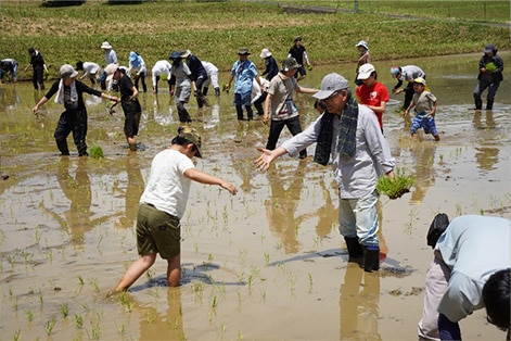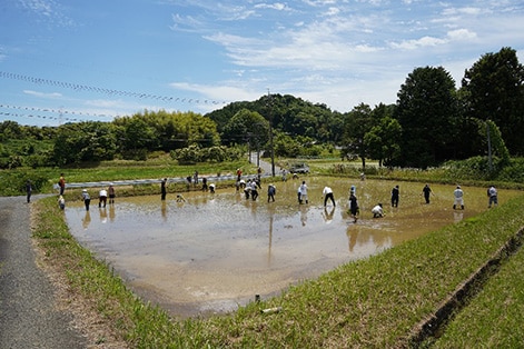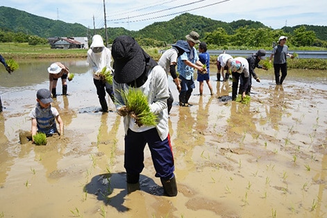 6月15日に、京都府北部にある綾部市の(株)丹波西山の田んぼで田植え体験を実施。島津従業員(海外従業員を含む)とその家族、約40名が参加。