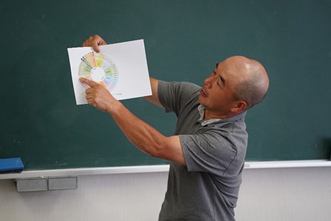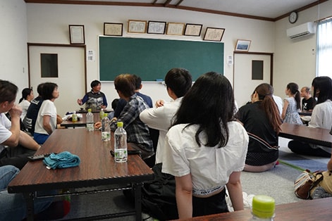 田んぼの中に入り、手作業で田んぼ一枚に苗を植えました。午後は、茶農家の櫻井喜仁先生から茶葉の香りと葉の開き方の違いなど紹介いただきました。最後に、丹波西山の西山和人社長による講話では、米作りへのこだわりやSDGsに関する取り組み、綾部で米作りを続ける想いについて聴講しました。