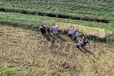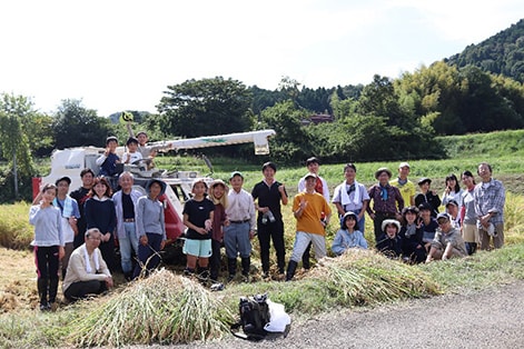 10月6日に、京都府北部にある綾部市の(株)丹波西山の田んぼで稲刈り体験を実施。島津従業員(海外従業員含む)とその家族、計30名が参加。